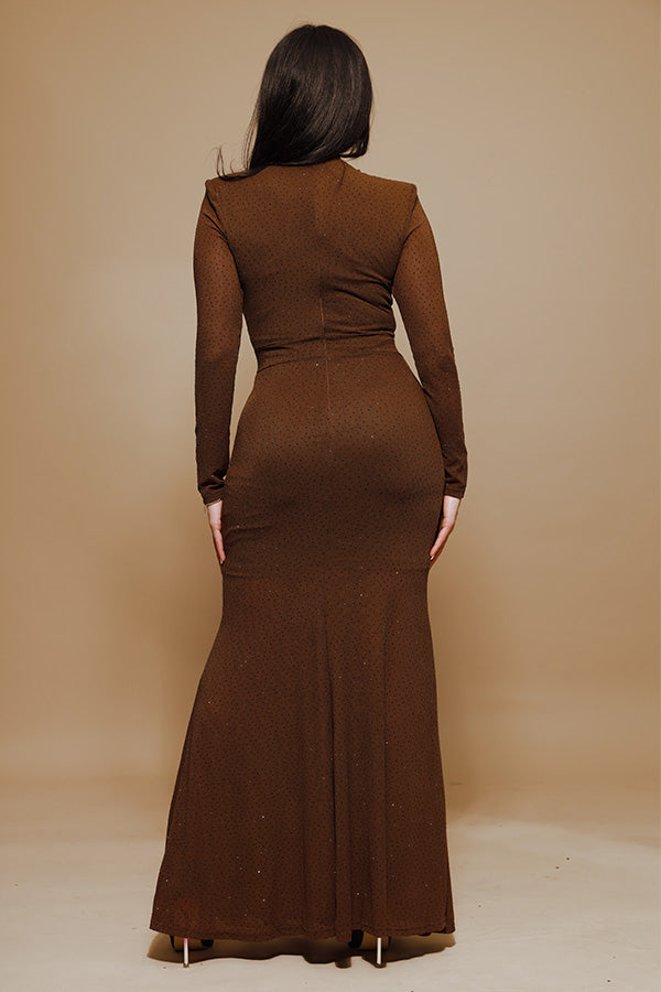Majestueuse, douce et scintillante, la Robe Longue « Mocha Majesty » est une pièce d’exception de La Scène – Acte I.