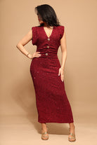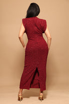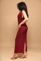 Sa coupe longue ultra-féminine épouse les formes tout en offrant une silhouette élancée, tandis que son tissu entièrement recouvert de sequins bordeaux lumineux capte la lumière à chaque mouvement.