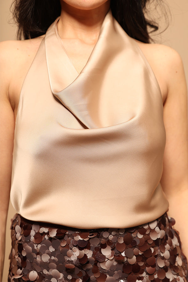 Découvrez l’élégance sensuelle du Top Satiné « Nude Drape », une pièce iconique de la collection La Scène – Acte I.