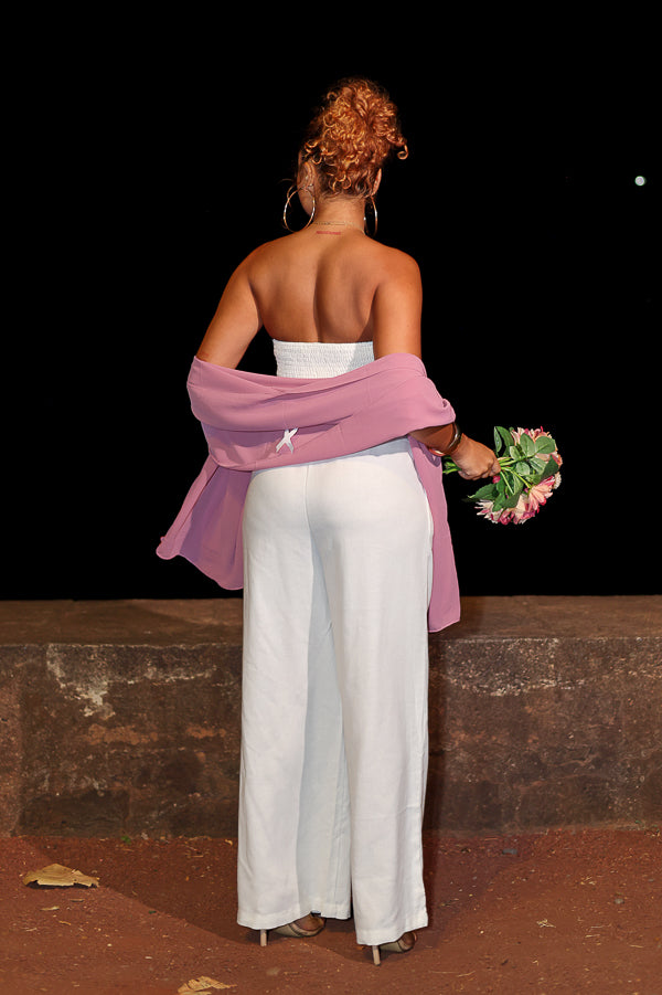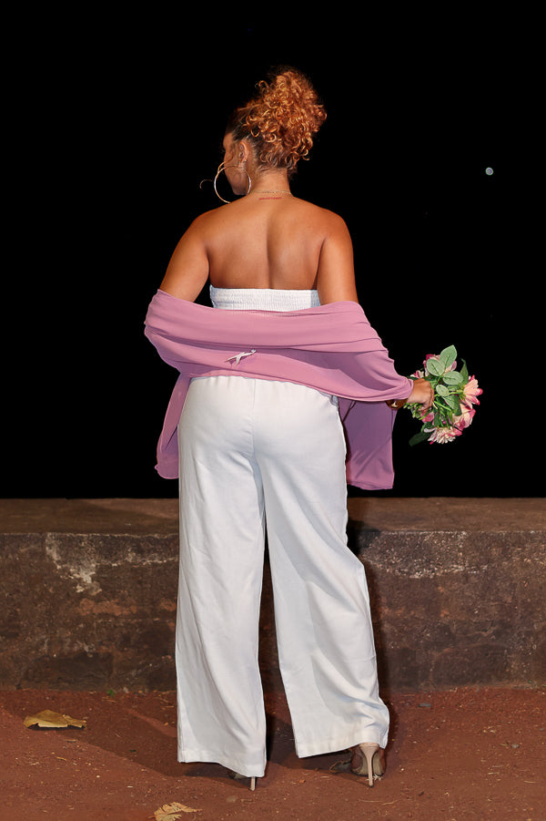 Composé d’un bustier minimaliste et d’un pantalon taille haute à coupe large, il met en valeur la silhouette tout en offrant une liberté de mouvement idéale.