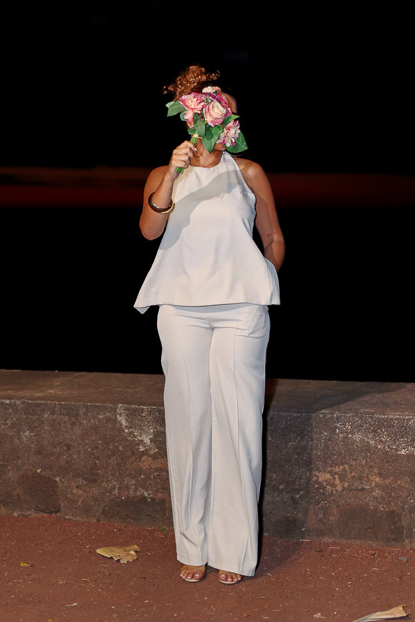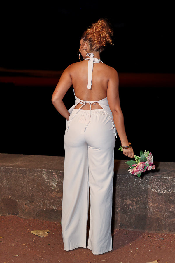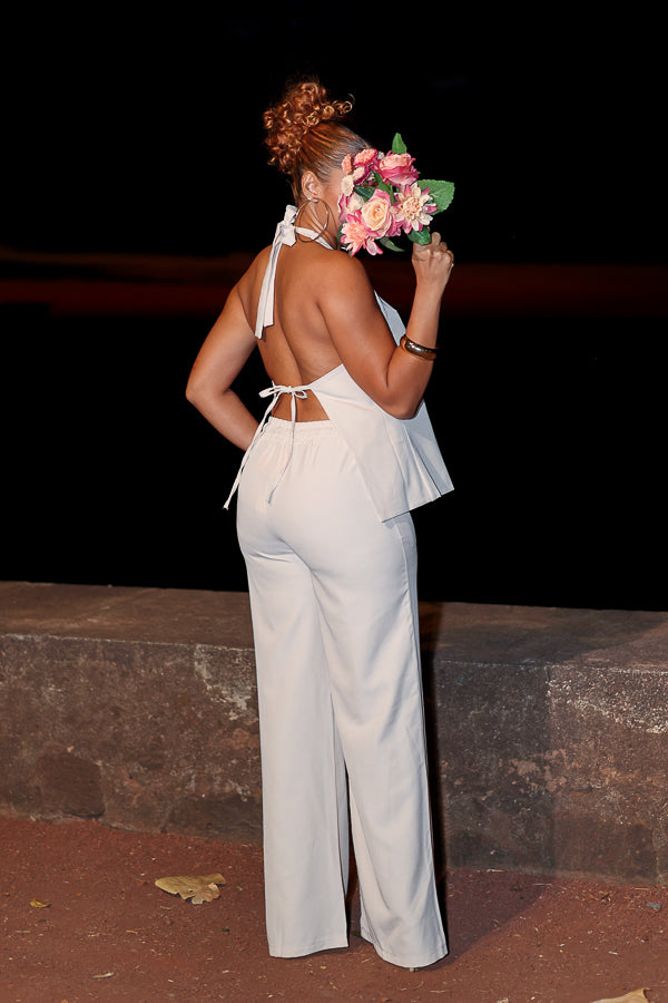 Élégant et intemporel, cet ensemble se compose d’un top dos-nu à nouer et d’un pantalon fluide taille haute.