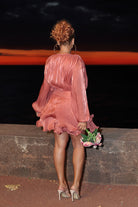 Avec son tissu lumineux qui capte délicatement la lumière et ses volants légers à la jupe, elle crée un mouvement raffiné à chaque pas. Les manches longues bouffantes et l’encolure délicatement froncée ajoutent une touche de féminité sophistiquée.