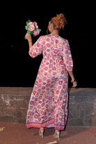 Élégante et pleine de caractère, cette robe longue au style bohème chic séduit par son imprimé floral multicolore aux tons de rose, orange et violet.