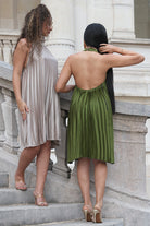 Son col halter met en valeur les épaules, tandis que le dos nu apporte une touche de sensualité tout en restant chic et raffinée.