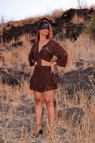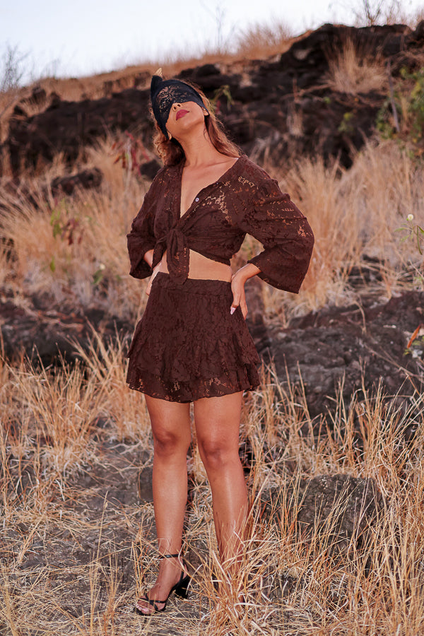 L’ensemble “Soleil Tanné” associe une chemise en dentelle ajourée à nouer et une jupe-short fluide à volants, pour un équilibre parfait entre allure sauvage et délicatesse bohème.
