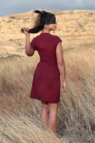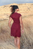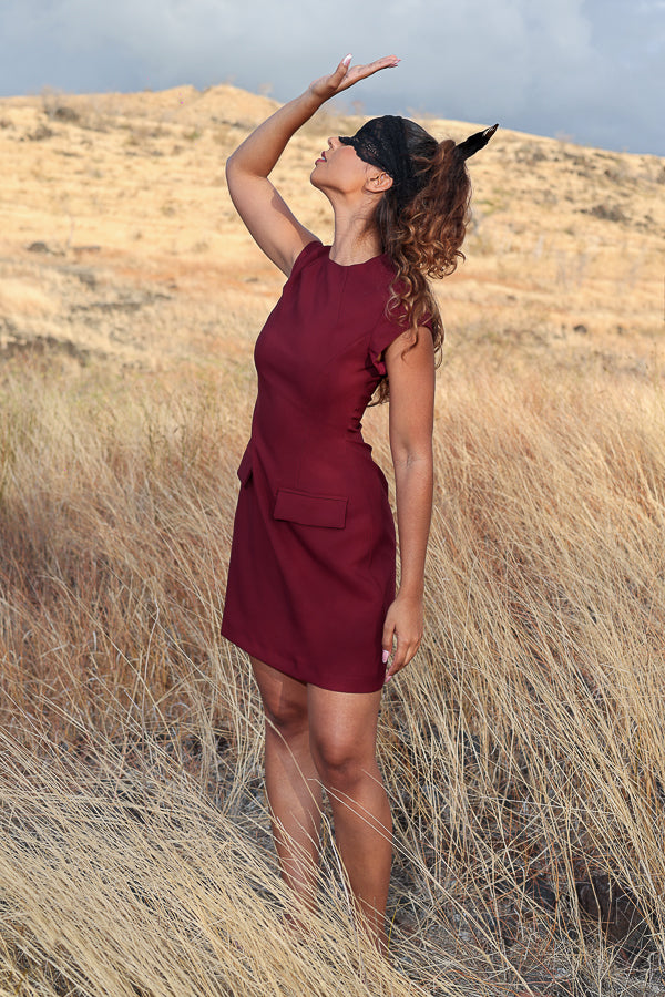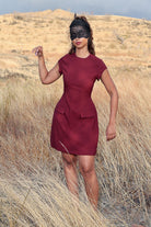 Cette robe courte bordeaux présente une coupe structurée qui met en valeur la taille et affine la silhouette. Ses manches courtes et son col rond apportent une touche élégante, tandis que les deux rabats décoratifs sur l’avant ajoutent un détail chic et moderne.