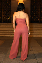 L’ensemble “Rosy Charm” associe un top bustier à décolleté subtil et un pantalon large taille haute en tissu gaufré fluide.