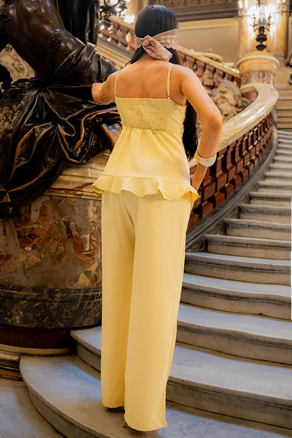 Faites une entrée remarquable avec l’ensemble Soleil d’Opéra, une pièce forte de notre nouvelle collection L’Été en Scène. Composé d’un top fluide à volants délicats et d’un pantalon large élégant, cet ensemble incarne la grâce, la féminité et l’audace estivale.