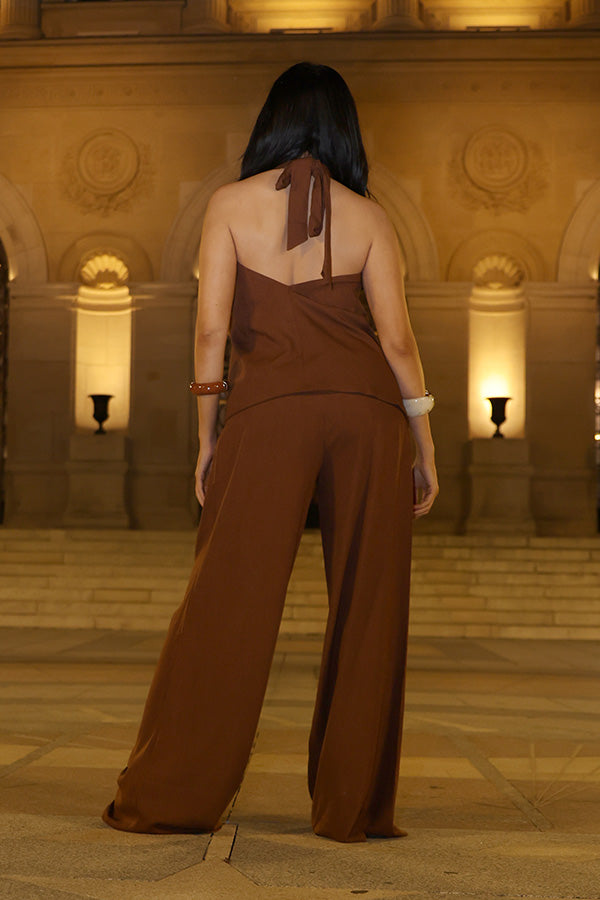 Adoptez l’élégance chaleureuse avec cet ensemble fluide pantalon et top croisé couleur chocolat intense. Le top à col croisé façon drapé sublime la silhouette avec sa coupe flatteuse, tandis que le pantalon taille haute aux jambes larges apporte confort et allure. Confectionné dans un tissu léger et agréable, cet ensemble offre liberté de mouvement et style raffiné, parfait pour toutes vos occasions.