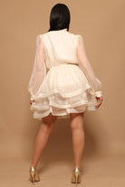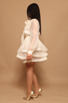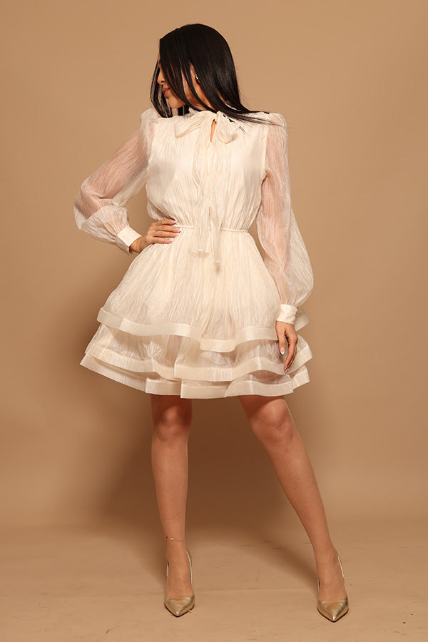 Confectionnée dans un organza subtilement texturé, elle séduit par ses manches longues transparentes, son col délicatement noué et sa taille cintrée qui structure la silhouette avec élégance.