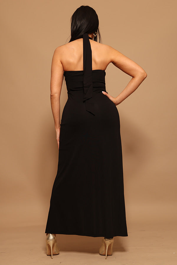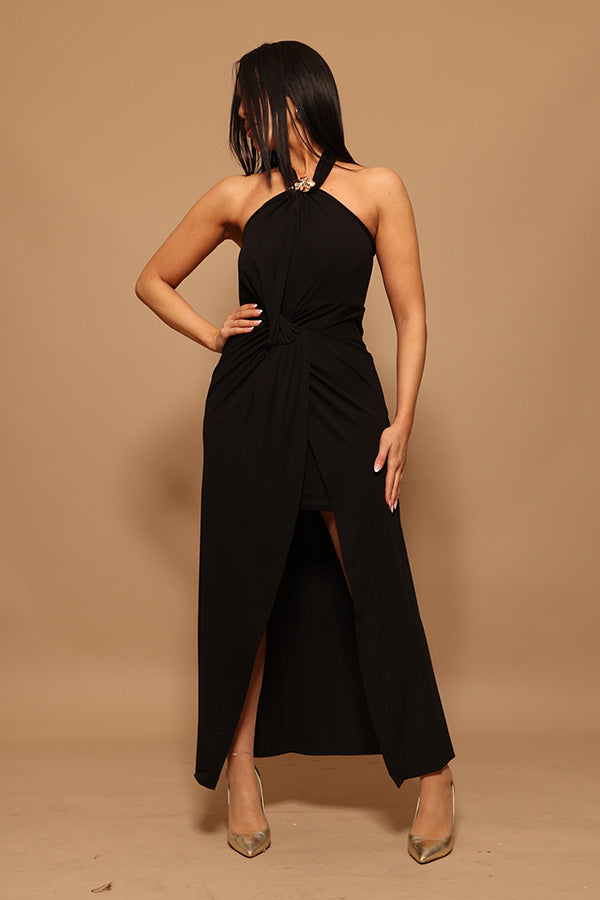 Robe longue au tombé fluide, sublimée par un bijou délicat au niveau du cou qui apporte une touche élégante et raffinée.