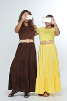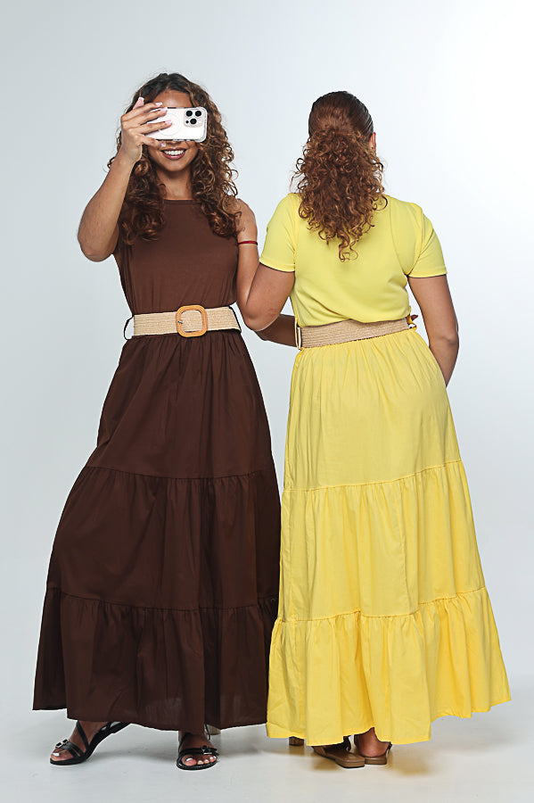Un hommage moderne à l’élégance sophistiquée des it-girls new-yorkaises. Cette robe longue bi-matière marie avec audace un haut côtelé à manches courtes, près du corps et flatteur, à une jupe évasée fluide et ceinturée, pour une silhouette structurée mais aérienne.