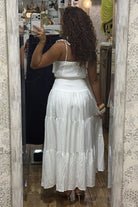 Le haut met en valeur le décolleté avec ses détails texturés raffinés, tandis que la jupe apporte du mouvement et une allure bohème chic irrésistible.