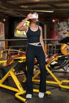 Alliez performance et style avec l’Ensemble Sport Marine, composé d’un top à bretelles croisées et d’un pantalon flare assorti.