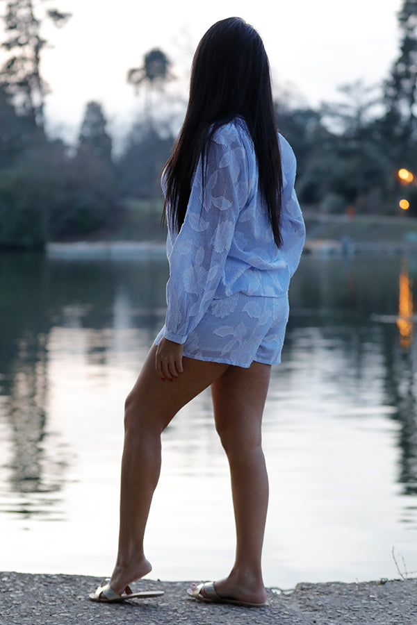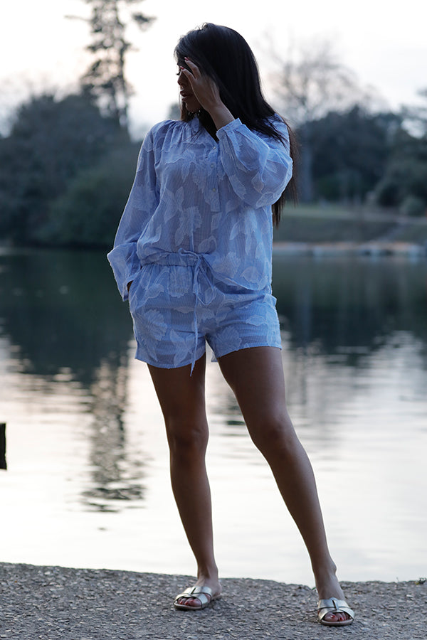 Cet ensemble 100% coton comprend une blouse et un short imprimé bleu et blanc pour un look frais et élégant. Fabriqué avec des matériaux de qualité, cet ensemble offre un confort et un style parfaits pour l'été. Parfait pour une journée ensoleillée, ce look vous fera vous sentir confiant et tendance !