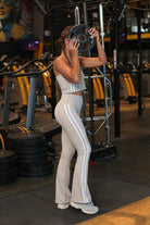 Alliez confort et style avec l’Ensemble Sport Chic, composé d’un haut bandeau moderne et d’un pantalon flare beige élégant. Les bandes blanches latérales et verticales ajoutent une touche sportive tendance tout en allongeant la silhouette.