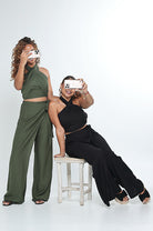 Un top croisé délicatement ajusté, un pantalon large à effet portefeuille qui danse à chaque pas…