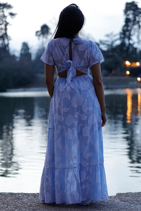 Découvrez notre robe longue en coton avec ses manches courtes et son col plongeant. L'attache au dos ajoute une touche d'originalité. Profitez du confort et de la légèreté de cette robe fleurie pour un look chic et élégant.